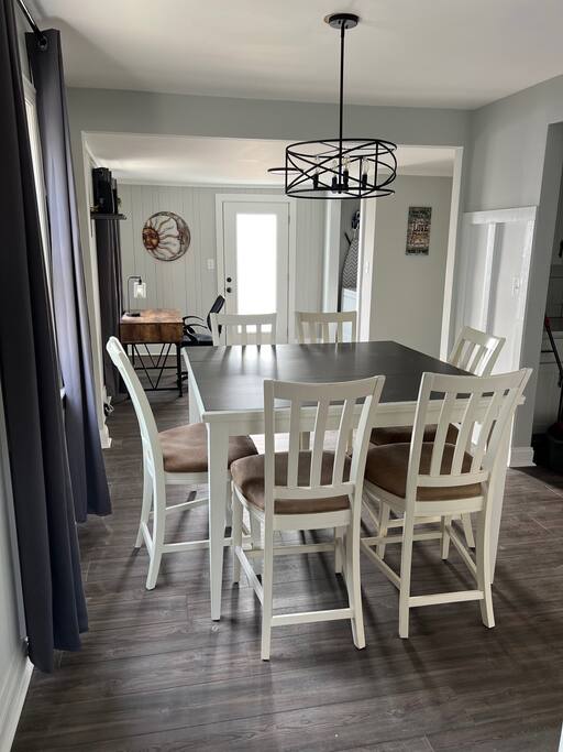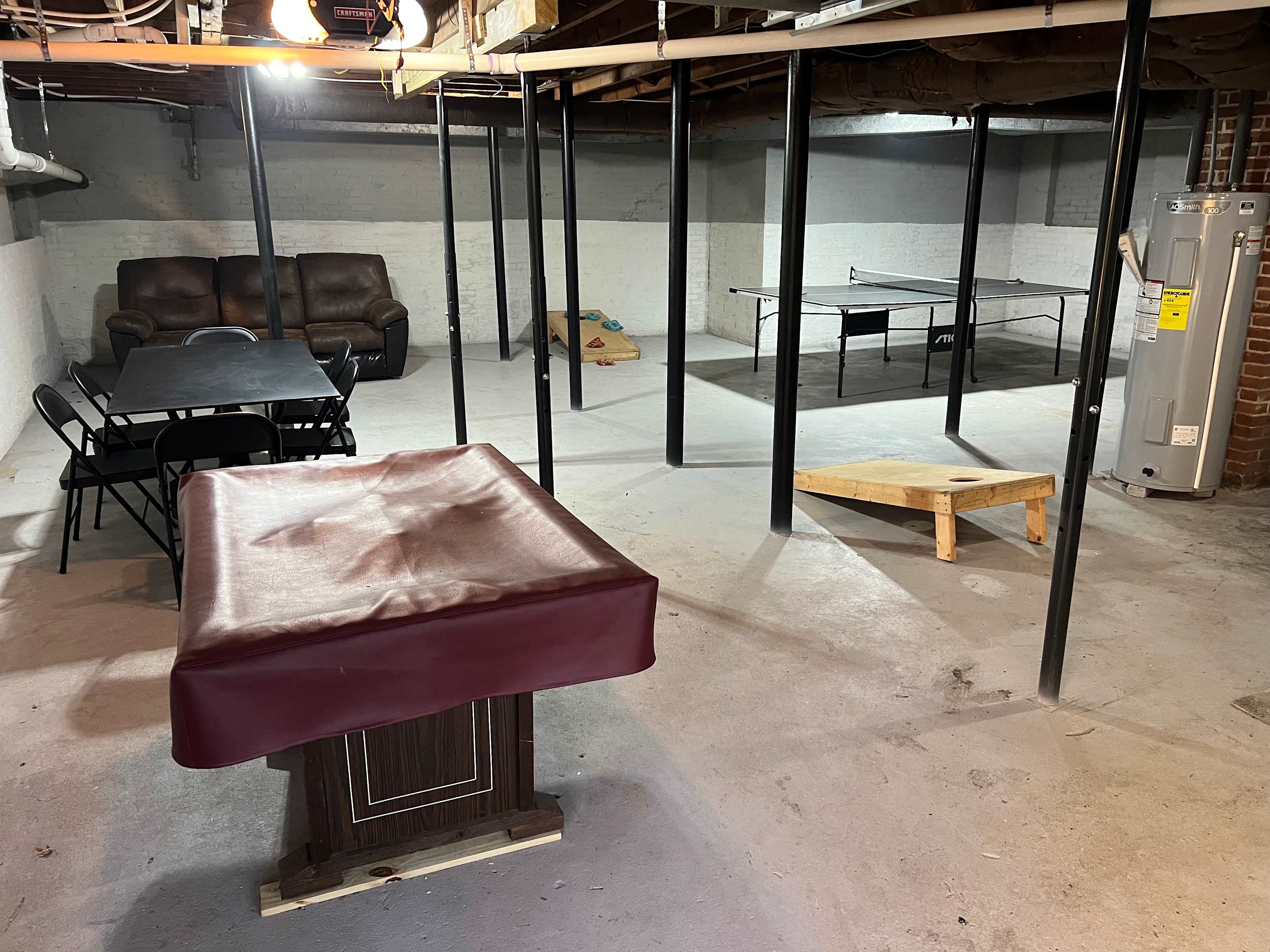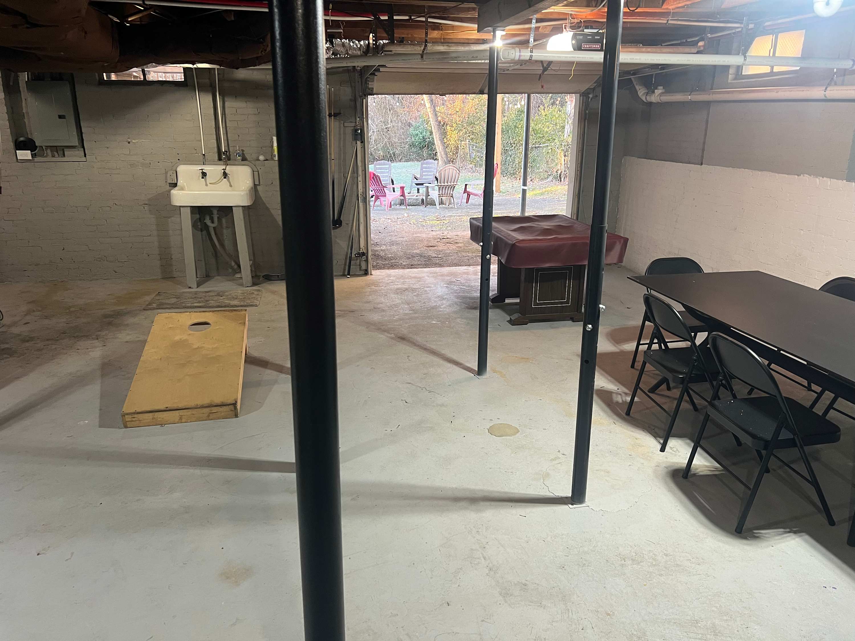 The bungalow provides a living room with a large sectional sofa and tv, a fully stocked kitchen with pots, pans, dishware and small appliances. The kitchen table includes seating for six. The bungalow includes a Master bedroom with a King bed and attached bathroom (walk in shower) and two bedrooms with Queen beds and a shared bathroom (bath tub). All bedrooms have tv's and room darkening curtains. There is also a washer and dryer as well as a desk/work area. Outside in the back yard, there is a fire pit and underneath (inside) the house is a ping pong table and casual seating.