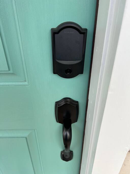Located at the front door is a push button key pad. To light it up you touch the bottom left corner and then put in your code. Please let the lock open all the way before entering. You should receive your code 48 hours before check in. If for some reason you don't please let me know.