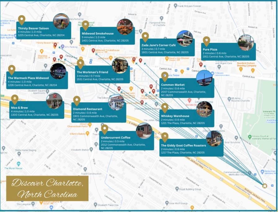 Plaza Midwood has several restaurants, bars all in walking distance from the house. Close to downtown.